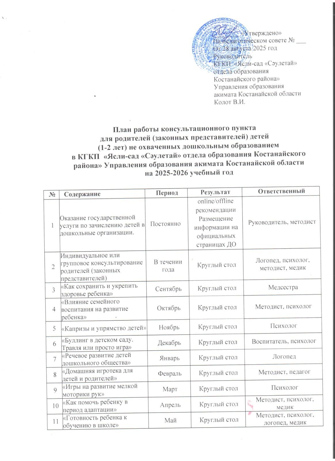 План работы Консультативного пункта на 2026 год